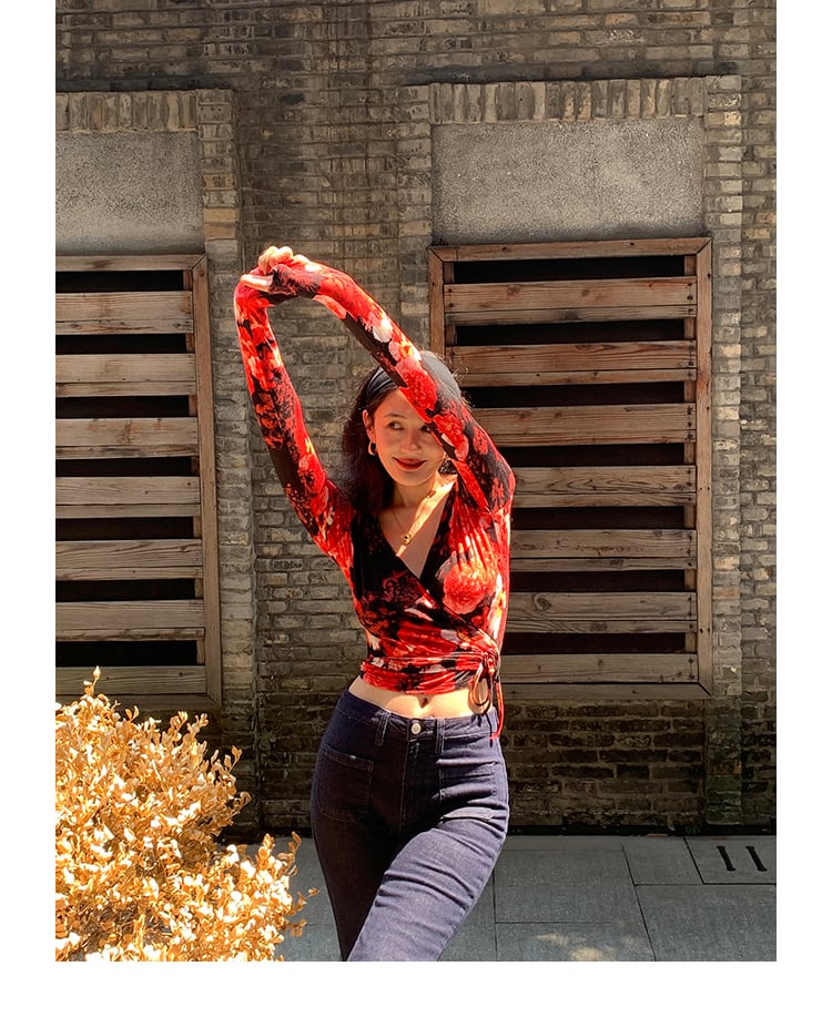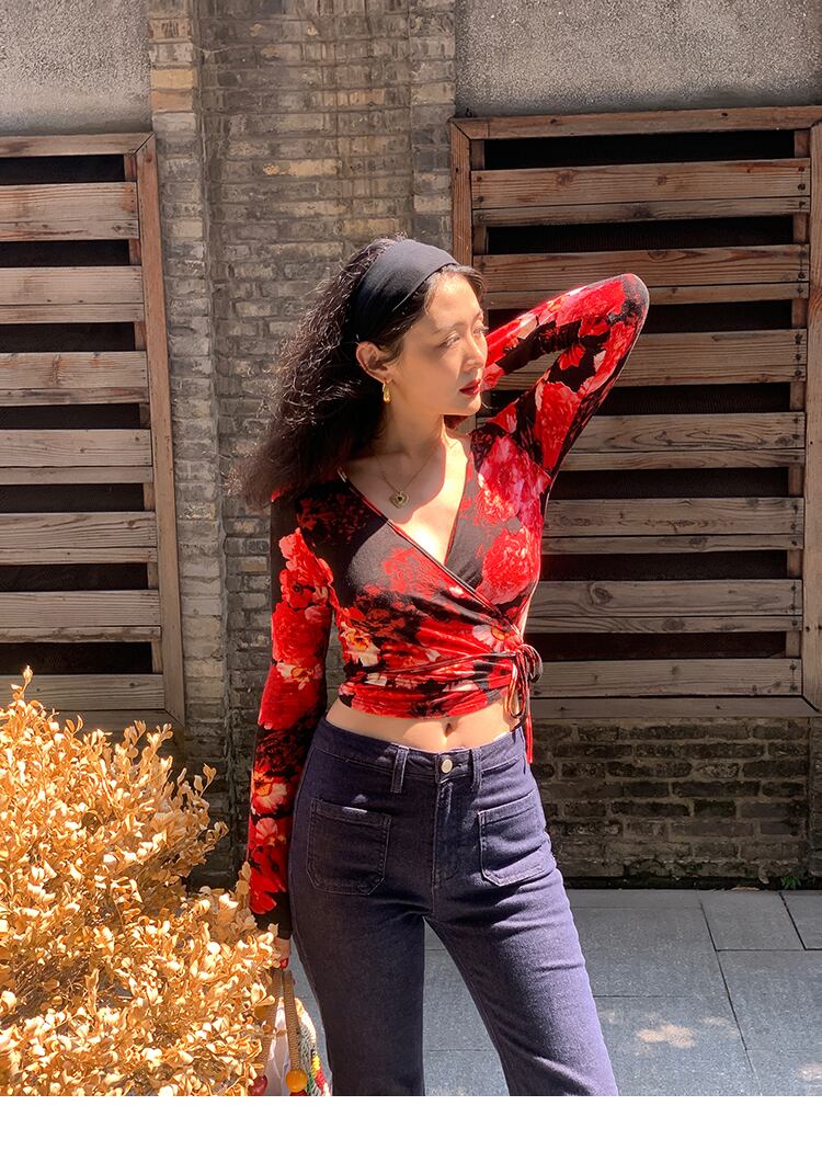 花柄 スリム Vネック 長袖 Tシャツ レディース 秋 フレンチ レトロ デザイン スリム トップス レッド ブルー S M トップス かわいい 大人可愛い きれいめ シンプル カジュアル 大人 上品 おしゃれ お洒落 大人可愛い 大人女子 キュート 春 夏 秋 10代 20代 30代 レディース 女性用 女の子 通勤 学生 通学 デート お出かけ 女子会 お泊まり 休日 パーティー イベント 旅行 普段使い ファッション コーデ スタイル インスタ映え 色展開