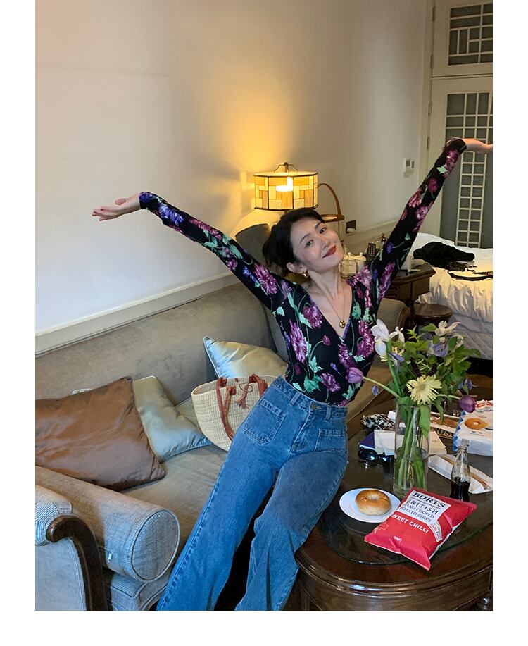 花柄のスリムなVネック長袖Tシャツは、おしゃれな女性にぴったりの一枚。是非あなたのスタイルに取り入れて、自分らしく輝いてください。
