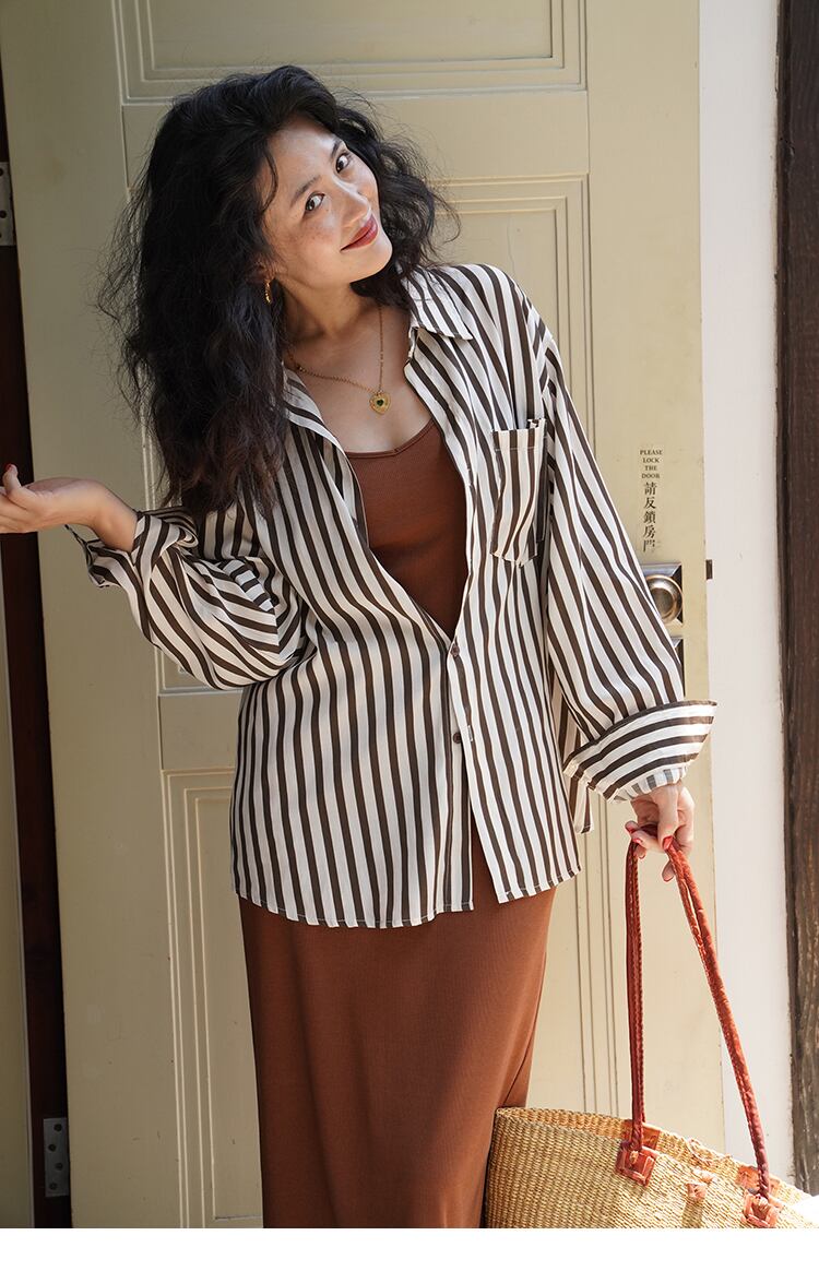 カジュアル ストライプ ロングスリーブ シャツ レディース 秋 フレンチレトロ ルーズトップ ブラウン フリーサイズ トップス かわいい 大人可愛い きれいめ シンプル カジュアル 大人 上品 おしゃれ お洒落 大人可愛い 大人女子 キュート 春 夏 秋 10代 20代 30代 レディース 女性用 女の子 通勤 学生 通学 デート お出かけ 女子会 お泊まり 休日 パーティー イベント 旅行 普段使い ファッション コーデ スタイル インスタ映え