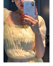 爽やかな夏のスタイルにぴったりの「プリーツ スクエア カラー パフスリーブ シャツ」をご紹介します。フレンチレトロなデザインが特徴で、シンプルでありながらも上品で大人可愛い雰囲気を演出します。ホワイトとイエローの2色展開で、どんなコーディネートにもマッチします。カジュアルなデートやお出かけ、通勤や学生の方にもおすすめです。