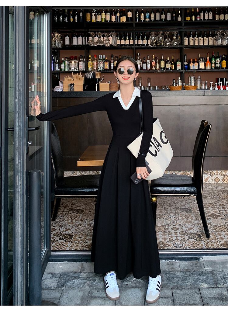 コントラストカラー ポロ ニット ドレス 女性 韓国 バージョン v ネック デザインセンス ニッチ ロングスカート ブラック グレー S M L トップス 袖あり かわいい 大人可愛い きれいめ シンプル カジュアル 大人 上品 おしゃれ お洒落 大人可愛い 大人女子 キュート 春 夏 秋 10代 20代 30代 レディース 女性用 女の子 通勤 学生 通学 デート お出かけ 女子会 お泊まり 休日 パーティー イベント 旅行 普段使い ファッション コーデ スタイル インスタ映え 色展開