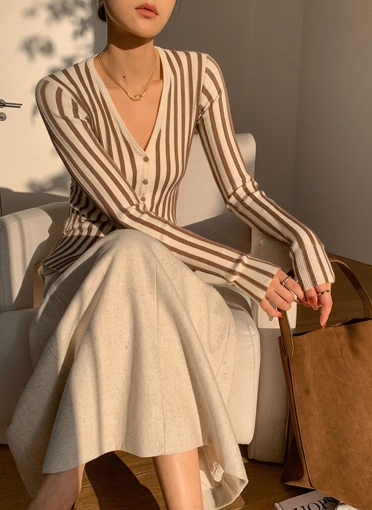 ストライプ V ネック ニット カーディガン 女性 秋 冬 トップ スリム フィット インナー ボトムス シャツ ブラウン SMLXL トップス かわいい 大人可愛い きれいめ シンプル カジュアル 大人 上品 おしゃれ お洒落 大人可愛い 大人女子 キュート 春 夏 秋 10代 20代 30代 レディース 女性用 女の子 通勤 学生 通学 デート お出かけ 女子会 お泊まり 休日 パーティー イベント 旅行 普段使い ファッション コーデ スタイル インスタ映え