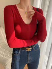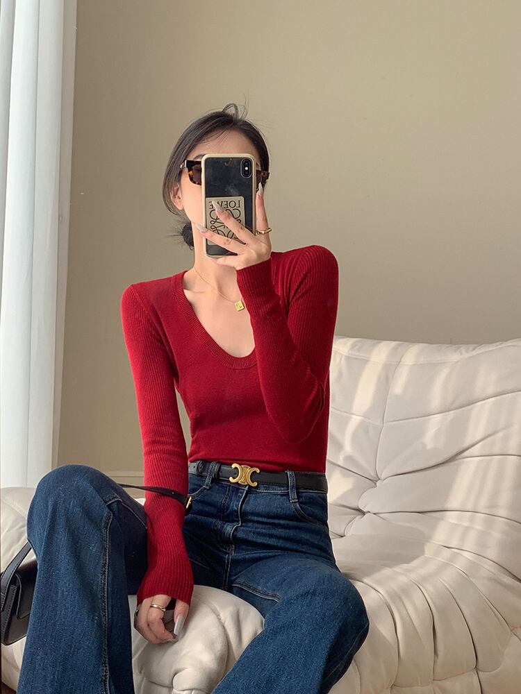 U ネック インナー ニット セーター 女性 秋 冬 スリム フィット オール マッチ ボトムス トップ レッド SMLXL トップス 袖あり かわいい 大人可愛い きれいめ シンプル カジュアル 大人 上品 おしゃれ お洒落 大人可愛い 大人女子 キュート 春 夏 秋 10代 20代 30代 レディース 女性用 女の子 通勤 学生 通学 デート お出かけ 女子会 お泊まり 休日 パーティー イベント 旅行 普段使い ファッション コーデ スタイル インスタ映え | ameiro18