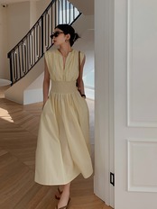 このノースリーブイエロードレスは、シンプルなデザインながらもウエストのスリムなシルエットとミディアム丈スカートが女性らしい美しいラインを演出してくれます。イエローカラーが夏の季節感を引き立て、明るく華やかな印象を与えます。