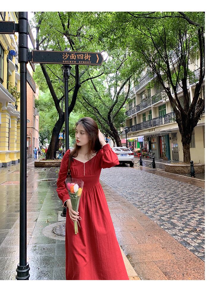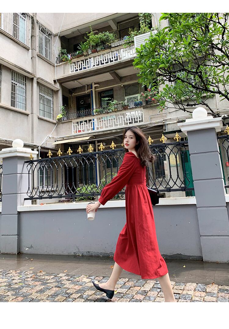 レトロでヘップバーンスタイルの赤い長袖ドレス。秋スタイルにぴったりのスリムなウエストとミドル丈スカート。カジュアルでも上品さを残すシンプルデザインで、大人可愛いおしゃれを演出。