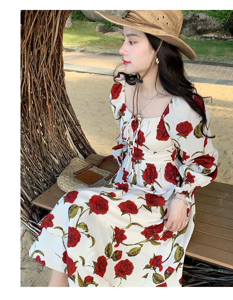 【商品名】フレンチ スタイル レトロ スクエアカラー 花柄 ドレス