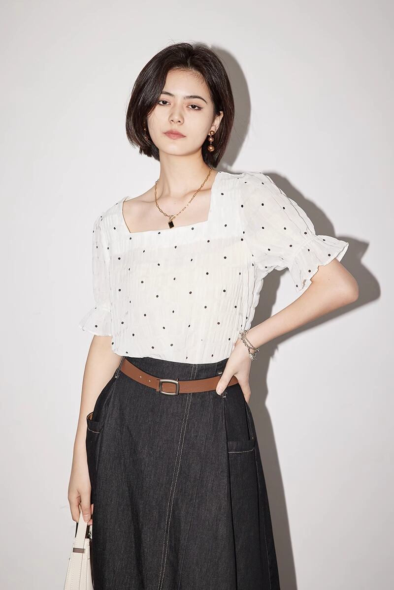レトロで文学感のあるデザインが特徴の、シフォン素材のシャツです。スクエアカラーできちんと感もあり、薄地で涼しい着心地が魅力。胸元の水玉タイがアクセントになっており、個性的な半袖Tシャツとして、通勤やデートのファッションでも活躍します。また、スクエアネックで襟がないので、上品な印象を与えます。白と黒の2色展開で、どんなコーディネートにも合わせやすいデザインです。
