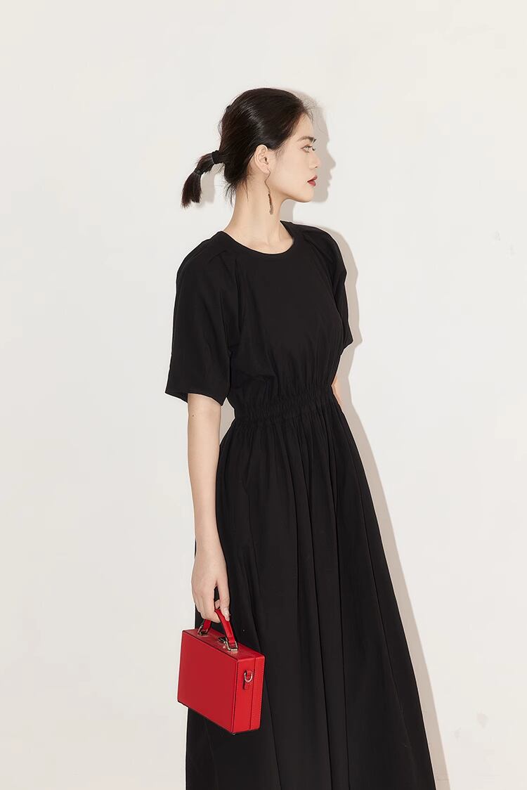 夏のおしゃれに欠かせない一枚。新しいスタイルでお届けするドレス スリム ウエスト スカート スリム ラウンドネック 半袖 ロング ドレス。