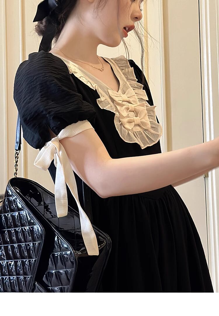 夏 蝶結び ワンピース 女性 大きいサイズ ワンピース 膝下 袖あり 半袖 パフスリーブ Vネック 襟なし かわいい 大人可愛い 大人 上品 おしゃれ お洒落 ラブリー キュート ガーリー 柄 春 夏 秋 10代 20代 30代 40代 50代 60代 レディース デート お出かけ 女子会 休日 パーティー イベント ファッション コーデ スタイル サイズ M L XL 2XL 3XL 色展開 黒 ブラック | ameiro18